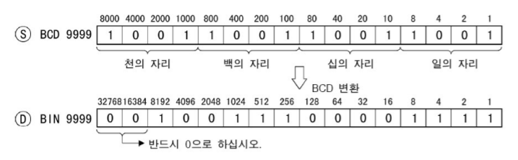 - 디바이스의 S`의 BIN 데이터를 BCD로 변환하여 지정된 디바이스 D`에 저장한다.