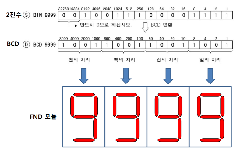 - MOV 명령어를 통해 FND 모듈로 출력을 하면 이값을 그대로 2진화 10진수로 표현이 된다.