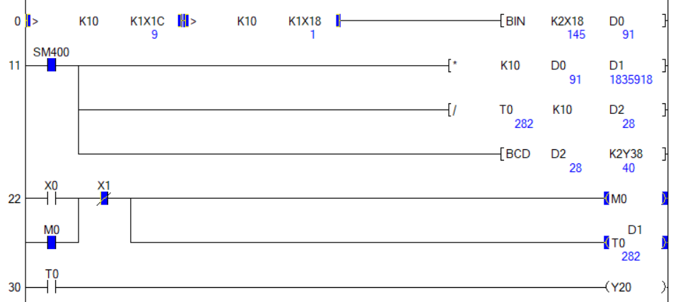 - X0을 누르면 타이머 설정시간 이후에 Y20이 점등되고 X1을 누르면 Y20이 소등된다.