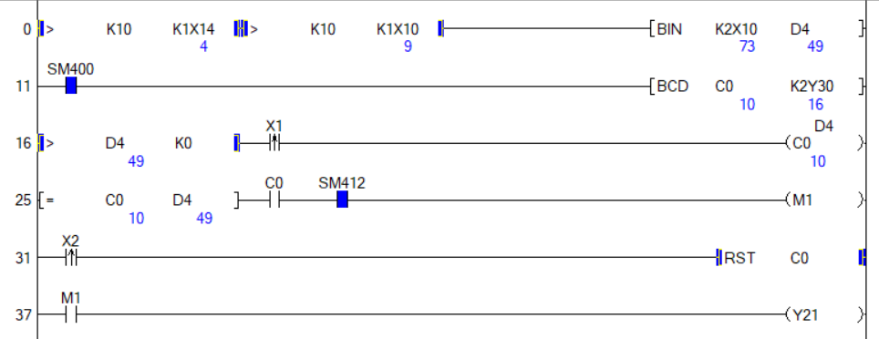 - 11 스텝 : SM400(항시ON)의 특수릴레이를 활용해서 카운터 계수값을 BCD 모듈에 출력한다.
