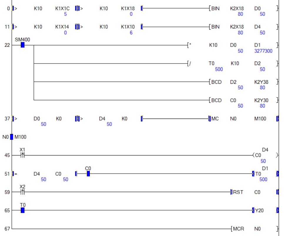 - 설정값1과 설정값2의 뺄셈 값이 음수일때 Y20이 점등되고 FND에는 양수값으로 표시