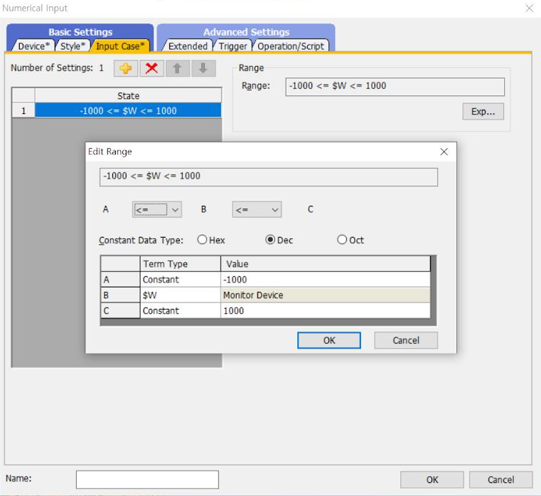 (3) Data Type, Device(입력, 출력 주소), Digit(자리수), Input case, Style 등 설정