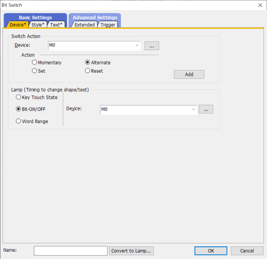 - 스위치 옵션 → Action : Alternate 선택 → Lamp : Bit on - off 선택