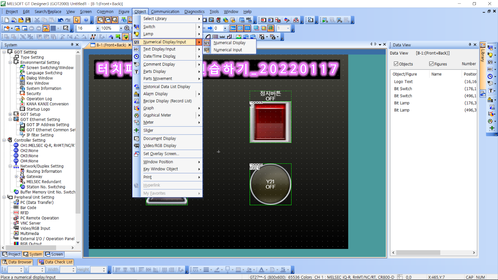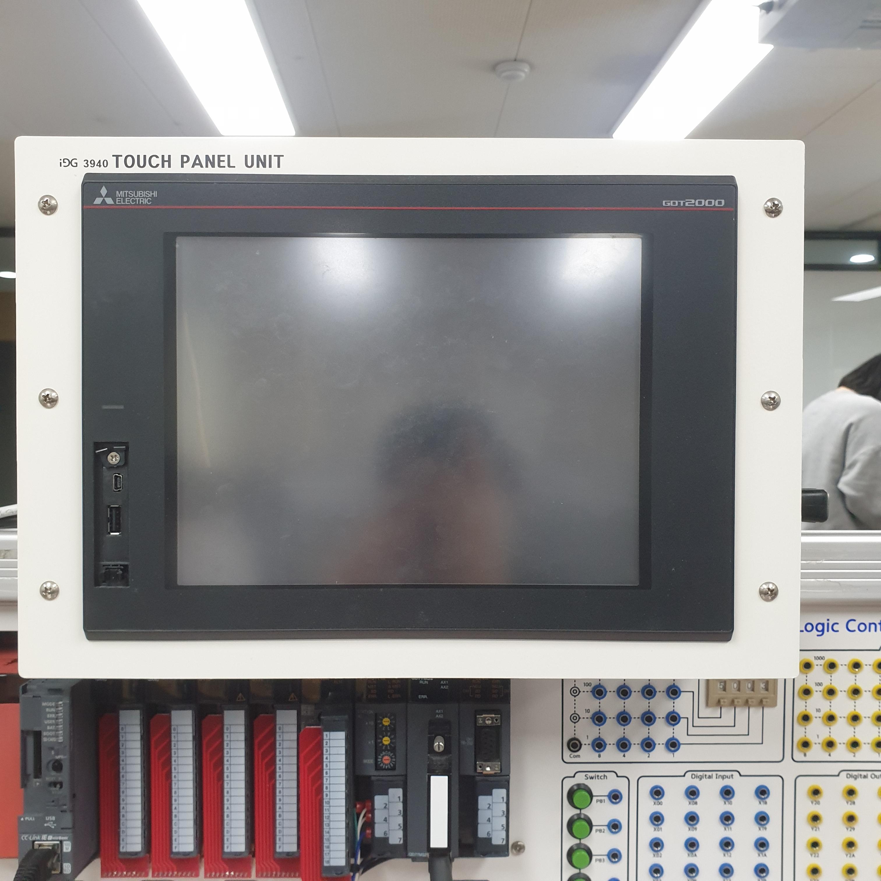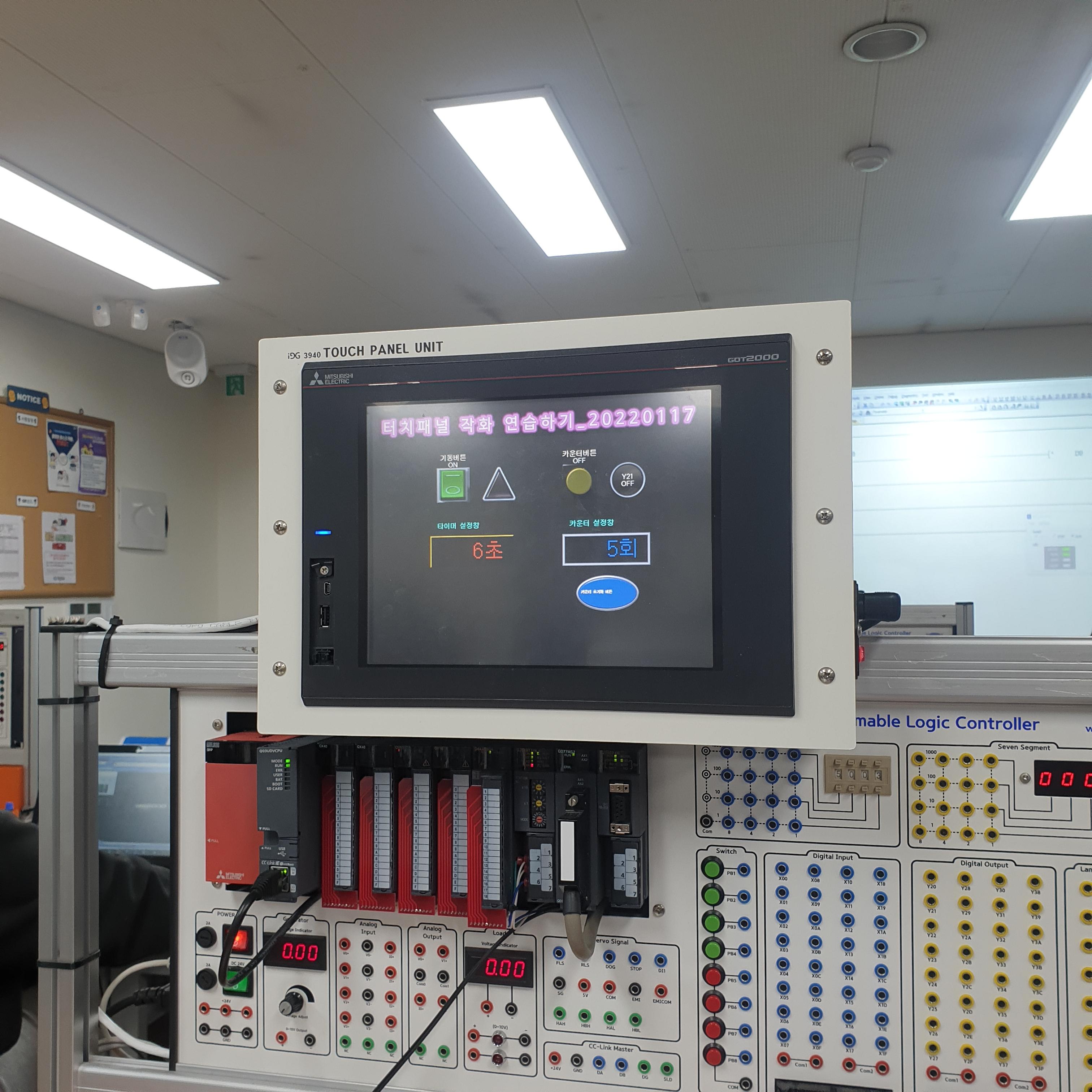 오늘은 미쓰비시의 HMI(터치판넬)을 활용해서 소프트웨어적으로 입력 및 출력을 생성하고 디자인적으로 구현해보는것을 배웠습니다. 그동안 바나나잭을 활용하고 실제 푸시버튼이나 램프를 활용해서 하드웨어적으로 결선을 했다면 이번에는 오로지 터치판넬만을 이용해서 입출력의 표현법(?)을 학습했습니다.