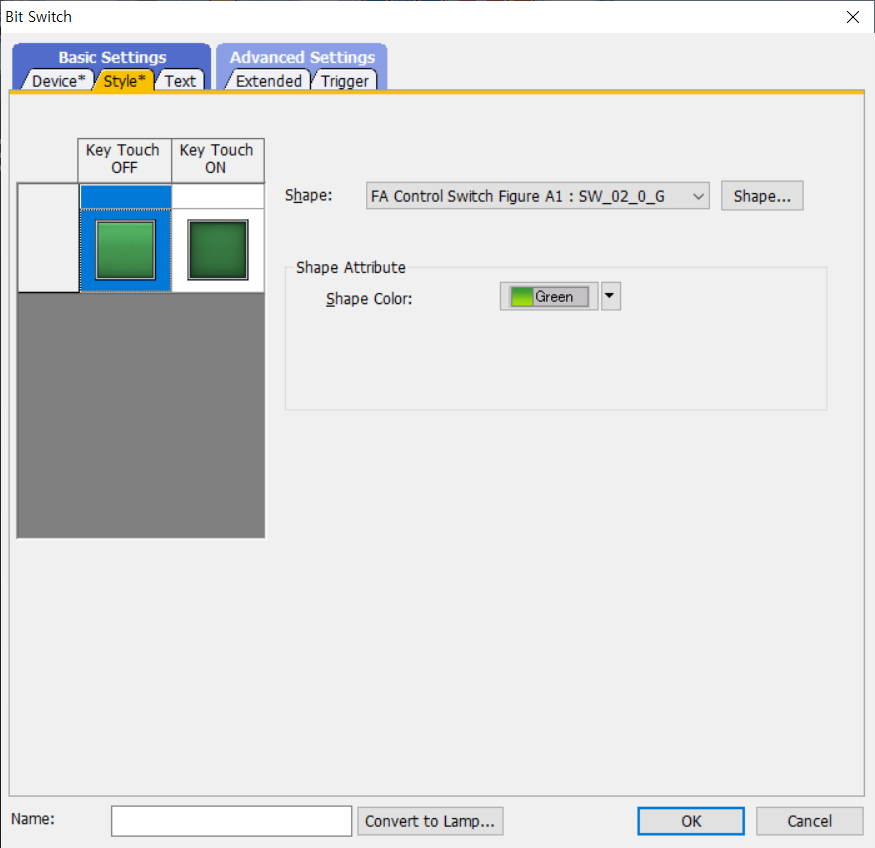(3) (GX WORKS2 래더프로그램 작성 후) → GT DESIGNER3 실행 → Object → Switch → Bit Switch 클릭 → 스위치 버튼을 만들고 해당 버튼을 더블클릭 하면 속성창이 열림