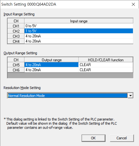 - 왼쪽 메뉴창에 Intelligent Funtion Module 생성 확인 → Switch Setting 클릭 → 채널별 Input 전압(전류) 범위 입력 →