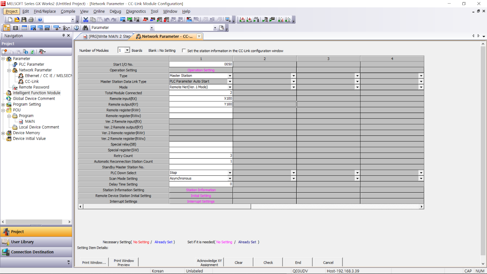 - 좌측 메뉴창의 CC-LINK에서 시작 I/O 번호, 전체 모듈 갯수, 입력 및 출력 시작 번호 설정