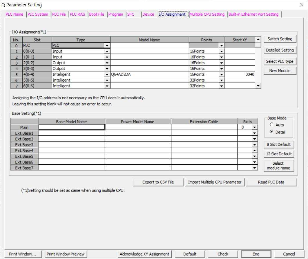 - 좌측 메뉴창의 PLC Parameter 설정창 → I/O Assignment 탭 클릭 →