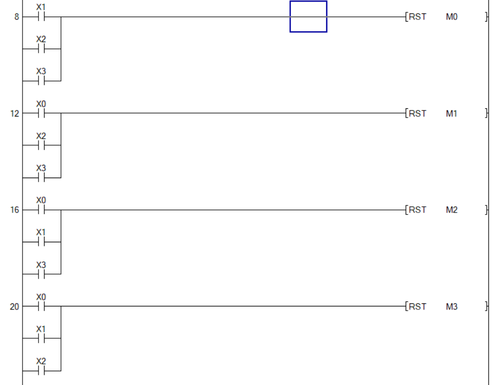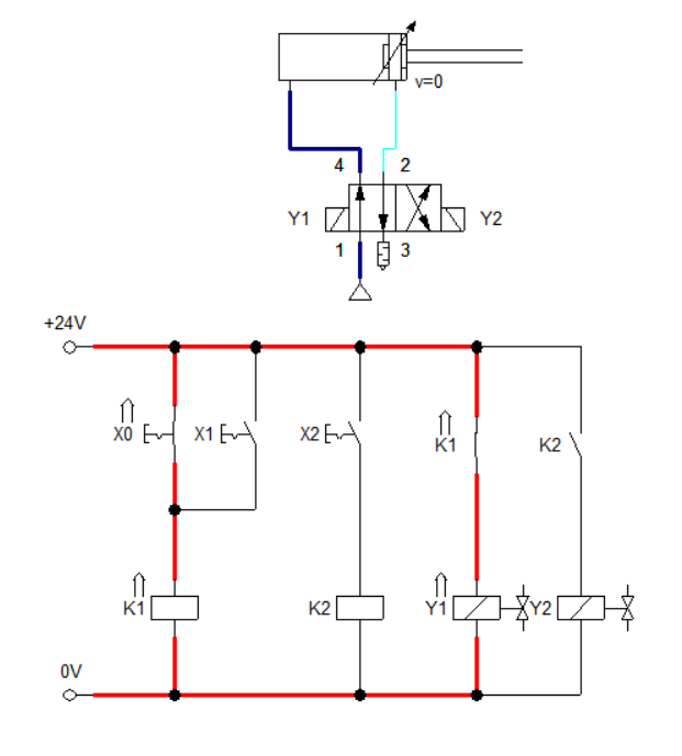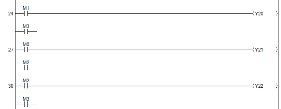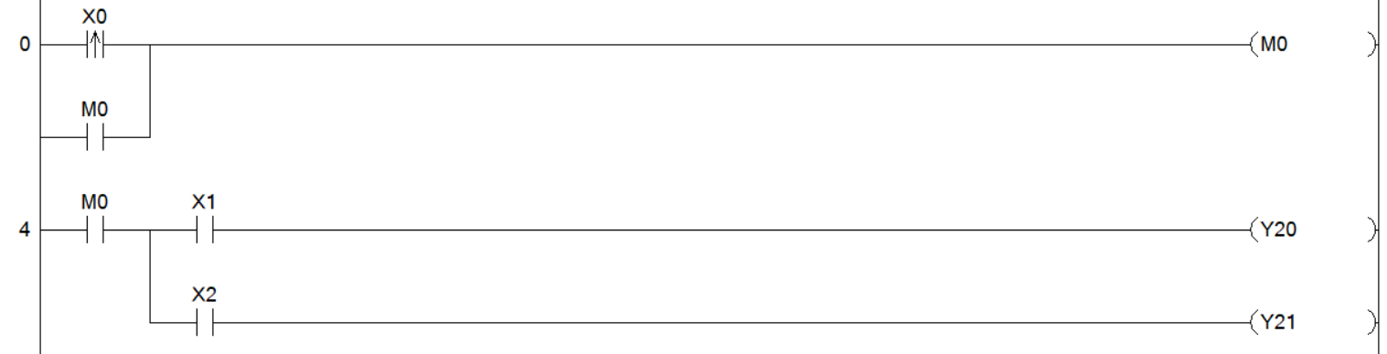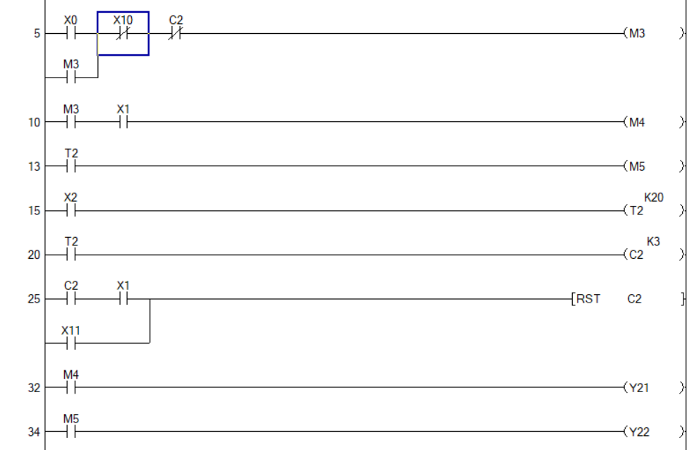 - 전진운동은 두곳의 입력(X0, X1)에서 받으며 실린더의 후진은 X2 입력으로 받는다.