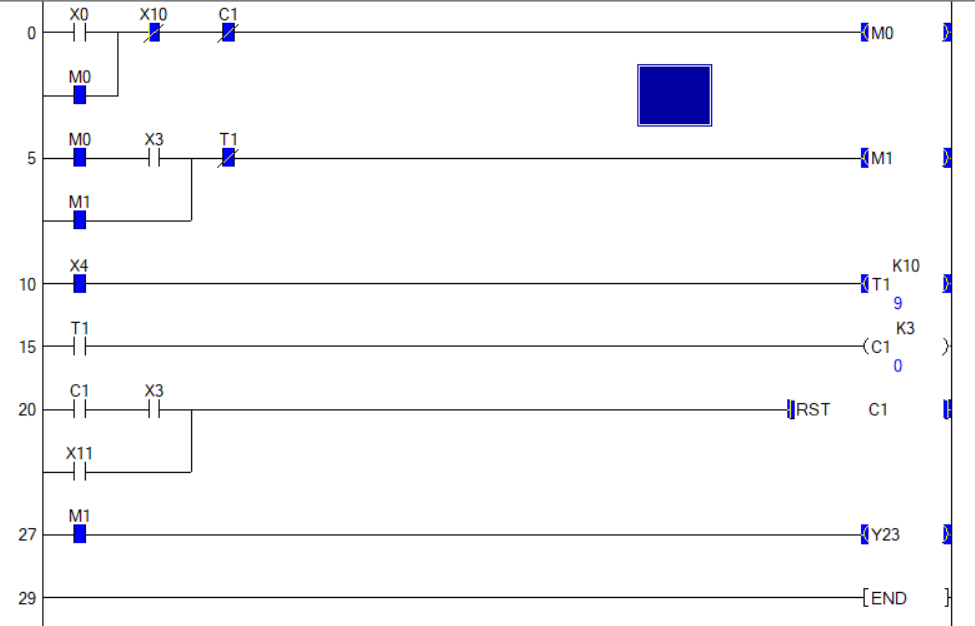 - 실린더가 3번째(카운터 횟수값)동작 후 후진해서 S3 Sensor의 값을 읽어들이면 20 Step 의 A접점 2개(C1, X3)가 B접점으로 바뀌면서 자동으로 카운터의 값을 초기화 시켜준다.