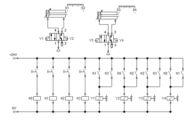 - 복동 실런더를 이용하여 Swivel Bridge를 상하로 이동시키고자 한다. 실린더는 푸시버튼 스위치로 제어하며, 전진 운동은 두군데에서 시킬 수 있어야 한다.