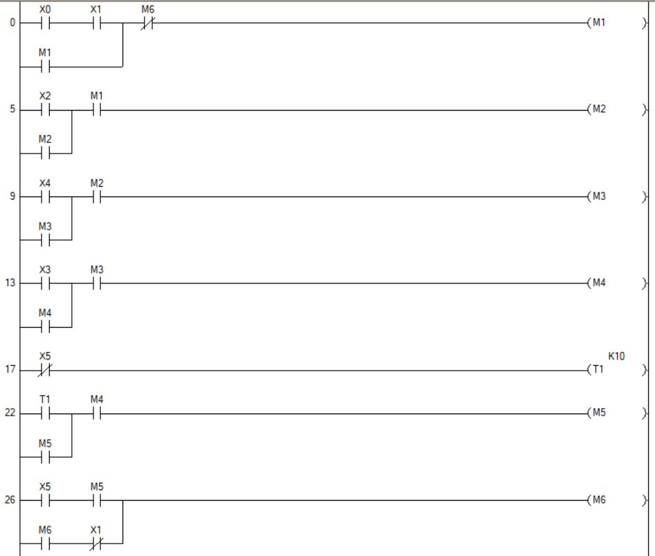 - S6 대신 S5접점의 반대접점을 사용해서 실린더가 전진되어있음을 확인하고 타이머를 동작해서 일정 시간 후에 자동으로 후진되도록 설계 하였음 (실무에서도 센서가 없으면 타이머로 대체해서 사용하기도 한다고..?)