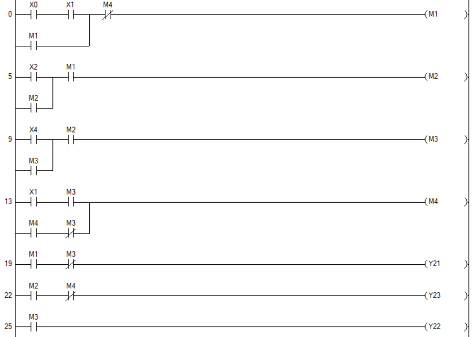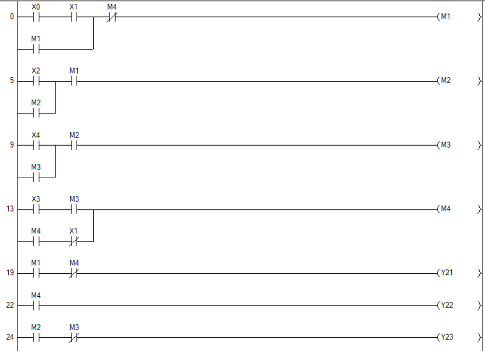 - 위의 시뮬레이션 설계에서 K4릴레이 위에 있는 K3(A접점) 및 K2(A접점)은 오류로 수정 필요.(아래 래더 프로그램 참고 요망)