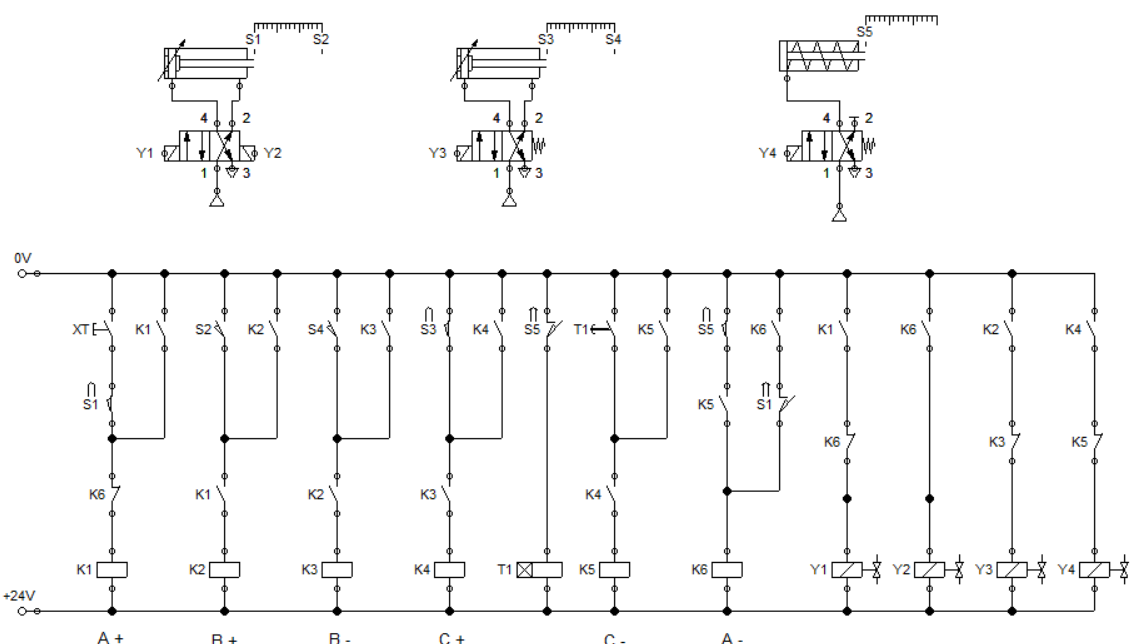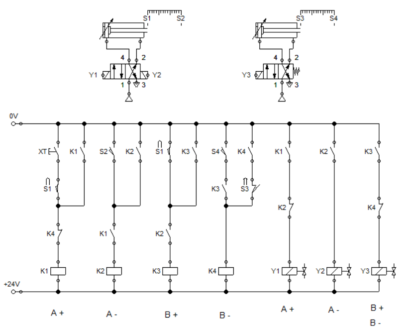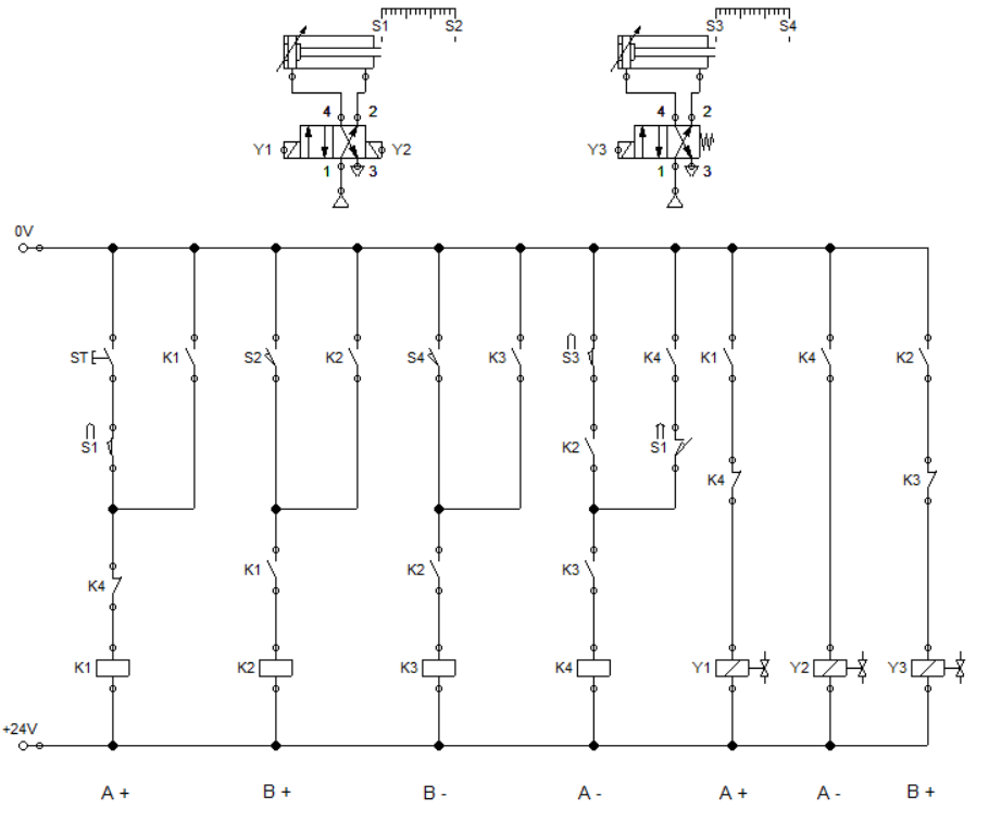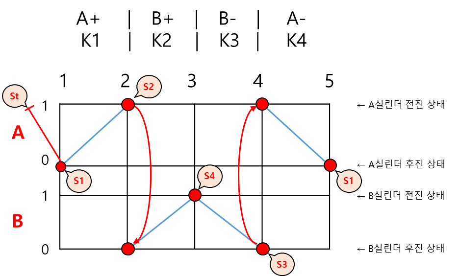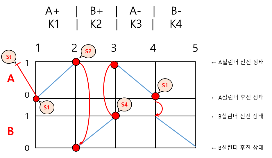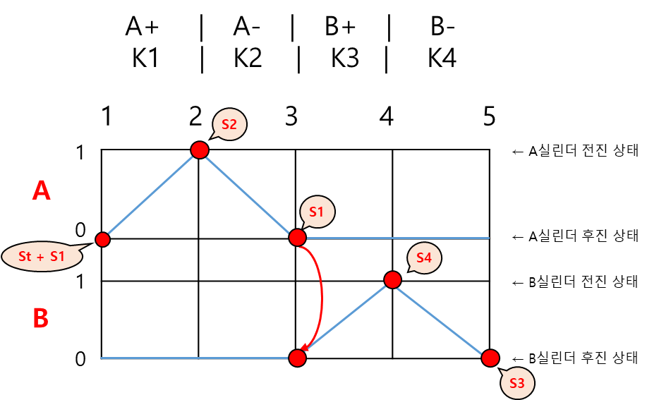 ✔ 위의 다이어그램 기준 B+(B실린더 전진) 동작이 수행되기 위해선 S2 센서가 입력되어야 한다.
