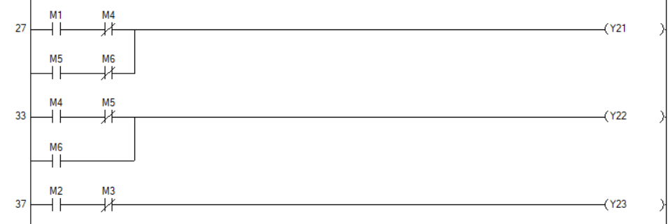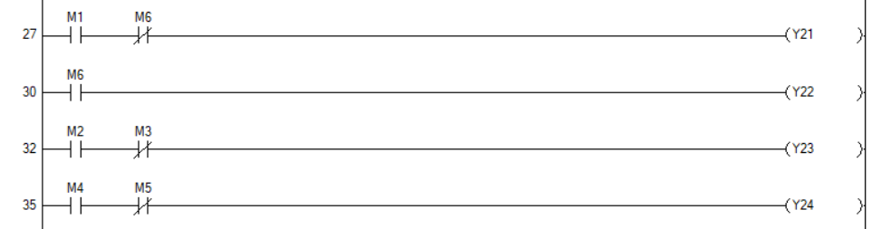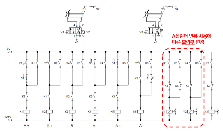 - 위의 기본 예제와는 다르게 A실린더의 동작이 B실린더 동작 후에 한번 더 수행됨에 따라 출력부(Y1, Y2) 변형