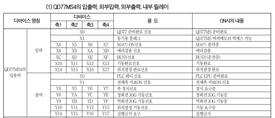 ※ 본실습에서 사용하는 위치결정모듈 QD77MS2는 2축짜리 카드로 위의 표에서는 축1과 축2만 해당된다. 또한, 실습장비의 카드는 7번 슬롯에 위치해있어서 디바이스 값을 +70을 해주어야 한다(EX. X0 → X70 / Y14 → Y84)