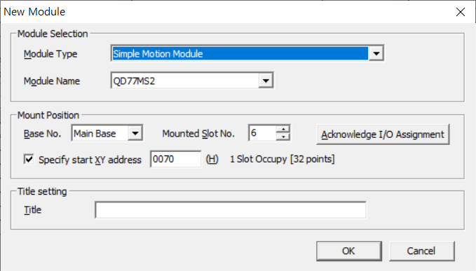 - 우측의 'New Module'을 클릭해서 'Simple Motion Module' Type의 'QD77MS2'를 찾고 'OK'